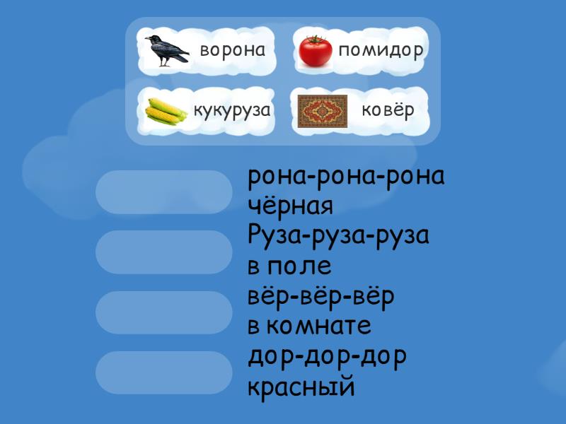 помидор - дор-дор-дор красный , ковёр - вёр-вёр-вёр в комнате , ворона - рона-рона-рона чёрная , кукуруза - Руза-руза-руза в поле ,