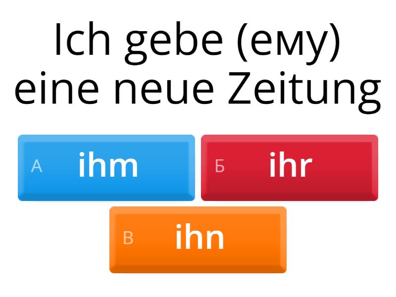 1) Ich gebe (ему) eine neue Zeitung a) ihm b) ihr c) ihn 2) Der Freund ruft (меня) a) mich b) mir c) dich 3) Wir besuchen (их) immer gern a) sie b) es c) ihr 4) Die Mutter gibt (мне) Limo a) ich b) mich c) mir 5) Das Kind zeigt (нам) sein Spielzeug a) ihr b) uns c) euch 6) Ich erzähle (ей) darüber a) ihm b) ihr c) ihnen 7) Wir wünschen (Вам) viel Glück a) ihr b) ihm c) Ihnen 8) Ich habe (тебя) lange nicht gesehen a) dir b) dich c) du 9) Der Lehrer erzählt (вам) viel Interessantes a) ihnen b) ihr c) euch 10) Wir kennen (ее) gut a) sie b) ihr c) ihn