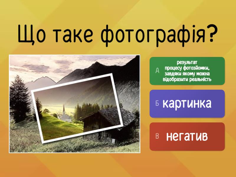 1) Що таке фотографія? a) результат процесу фотозйомки, завдяки якому можна відобразити реальність b) картинка c) негатив 2) Що означає в перекладі слово "фотографія"? a) "застигла картина" b) "світло" та "тінь" c) "світло" та "пишу" 3) Які існують напрями фотографії ? a) Минулого і майбутнього b) Документальна і художня c) Кольорова і чорно-біла d) Реальна і містична 4) Хто вважається винахідником фотографії? a) Вілям Шекспир b) Нісефор Ньєпс c) Мікеланжело d) Огюст Люм'єр 5) Напрям фотомистецтва, який призначений для зображення дрібних об'єктів у великому масштабі, це... a) пейзаж b) натюрморт c) макрофотографія 6) Напрям фотомистецтва, що дає можливість відчути себе птахом і побачити нашу планету з висоти пташиного лету: a) фотомонтаж b) фотоарт c) аерофотографія d) фотоколаж 7) Найпопулярніші жанри фотомистецтва: a) Пейзаж, репортаж b) Репортаж, портрет c) Пейзаж, портрет, репортаж d) Портрет, пейзаж 8) Напрям фотографії, що фіксує об’єктивну реальність: a) Художня фотографія b) Документальна фотографія c) Анімаційна фотографія 9) Що таке фейк? a) Правда, точна інформація b) відомо підроблена або повністю вигадана інформація. c) Брехня заради добра 10) Оперативний жанр фотожурналістики, що складається із серії знімків, на яких висвітлюється певна подія, це... a) фоторепортаж b) фотографія c) фотозйомка d) фотозвіт 11) Визначить напрям фотографії: a) художня b) документальна c) патріотична d) історична 12) Хто може поширити фейк? a) Відомий блогер b) ЗМІ c) Звичайна людина d) Усі вищезазначені