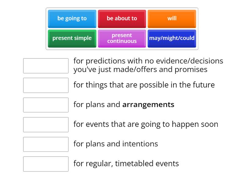 be about to - for events that are going to happen soon, present continuous - for plans and arrangements, may/might/could - for things that are possible in the future, be going to - for plans and intentions, present simple - for regular, timetabled events, will - for predictions with no evidence/decisions you've just made/offers and promises,