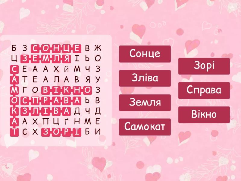 Зліва - Зліва, Справа - Справа, Вікно - Вікно, Сонце - Сонце, Земля - Земля, Зорі - Зорі, Самокат - Самокат,