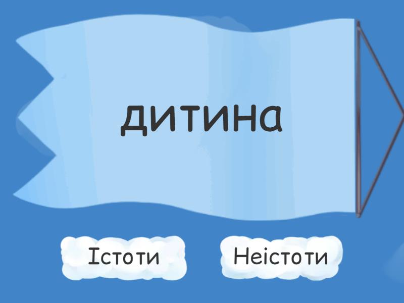 Істоти: дитина, комар, Марія, ферзь, покійник, корова, кішка, курча, водяник, Бог, Неістоти: сніг, береза, вірус, клас, мікроб, зошит, бацила, село, хор, мрія,
