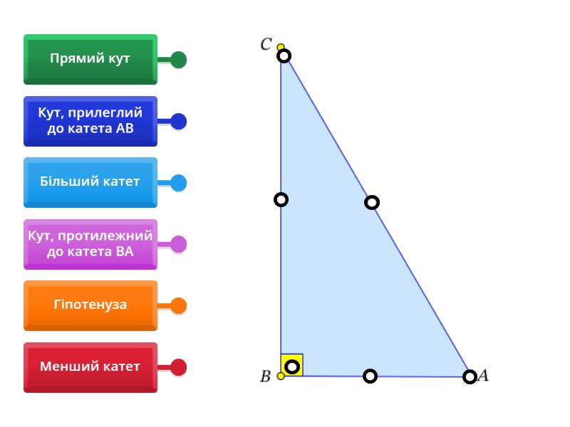 Більший катет, Менший катет, Гіпотенуза, Прямий кут, Кут, протилежний до катета ВА, Кут, прилеглий до катета АВ.