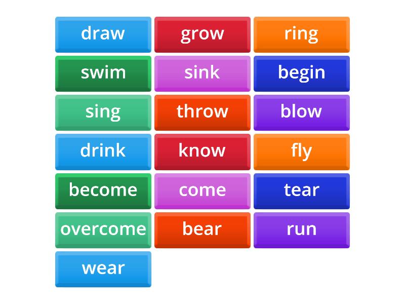become, come, overcome, run, begin, drink, ring, sing, sink, swim, bear, tear, wear, blow, draw, fly, grow, know, throw,