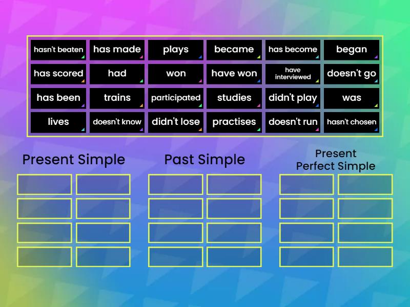 Present Simple: lives, doesn't know, studies, practises, trains, plays, doesn't run, doesn't go, Past Simple: was, participated, began, became, won, didn't lose, didn't play, had, Present Perfect Simple: has scored, have won, hasn't chosen, has made, hasn't beaten, has been, have interviewed, has become,