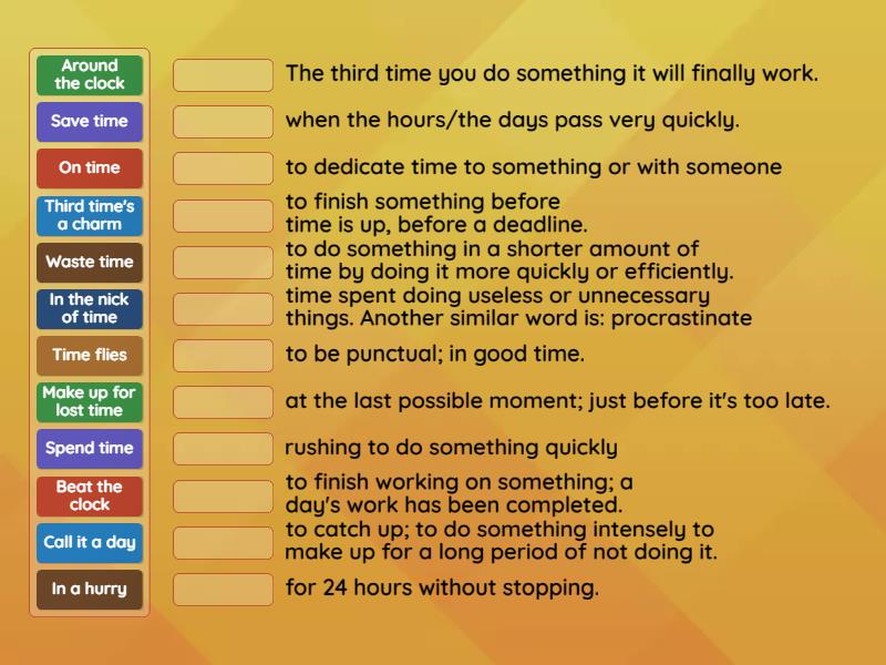 Time flies - when the hours/the days pass very quickly., Save time - to do something in a shorter amount of time by doing it more quickly or efficiently., Waste time - time spent doing useless or unnecessary things. Another similar word is: procrastinate, In a hurry - rushing to do something quickly , Spend time - to dedicate time to something or with someone, On time - to be punctual; in good time., Beat the clock - to finish something before time is up, before a deadline., Make up for lost time - to catch up; to do something intensely to make up for a long period of not doing it., In the nick of time - at the last possible moment; just before it's too late., Around the clock - for 24 hours without stopping., Call it a day - to finish working on something; a day's work has been completed., Third time's a charm - The third time you do something it will finally work.,