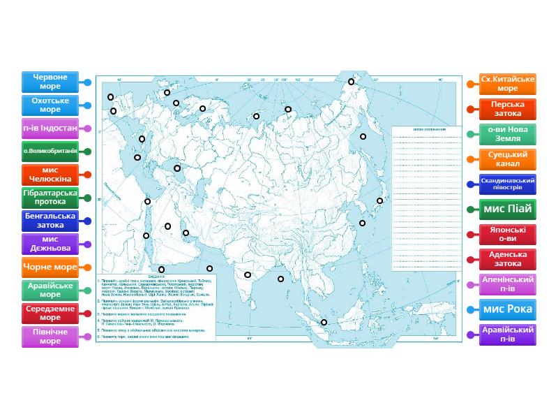 Крайні точки, острови,півострови,моря,затоки,протоки Євразії