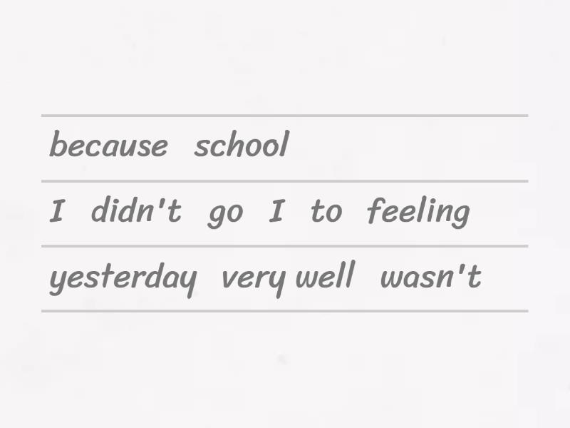 I didn't go to school yesterday because I wasn't feeling very well, I was watching TV last night when I heard a strange noise upstairs, While I was reading my book,the lights suddenly went off, The men were robbing the bank when the police arrested them, Last night I had dinner and then I did my homework, We saw the police chasing some men when we were walking to school, The man stole my mobile phone while I wasn't looking, The phone rang five times but nobody answered it, Ben and I went to the cinema last weekend and we saw the new James Bond film, While Jane was driving to work, a dog suddenly ran in front of her car, I was riding my bike in the park last week when I fell off and broke my arm, Janice and I were playing tennis when she slipped and hurt her knee, I was swimming in the sea when two beautiful dolphins appeared, As I was writing an email my computer stopped working, While we were waiting for the bus, we played a game of 20 questions, We wanted to see the concert so we went online to look for tickets,
