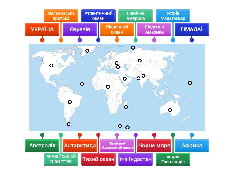 Африка, Тихий океан, Південний океан, Австралія, Північний Льодовитий океан, Атлантичний океан, Північна Америка, Антарктида, Євразія, острів Мадагаскар, Чорне море, Магеланська протока, острів Гренландія, Південна Америка, ГІМАЛАЇ, АРАВІЙСЬКИЙ ПІВОСТРІВ, УКРАЇНА, п-в Індостан.