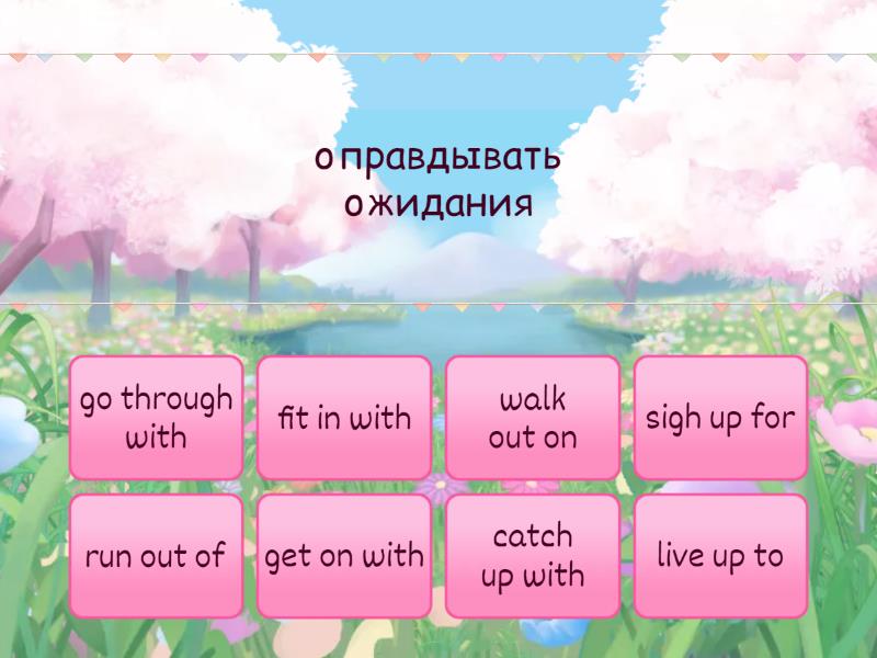 live up to - оправдывать ожидания, walk out on - бросить в беде, fit in with - соответствовать, get on with - ладить, sigh up for - подписываться на, catch up with - встретиться, go through with - преоделеть,пережить, run out of - закончиться,