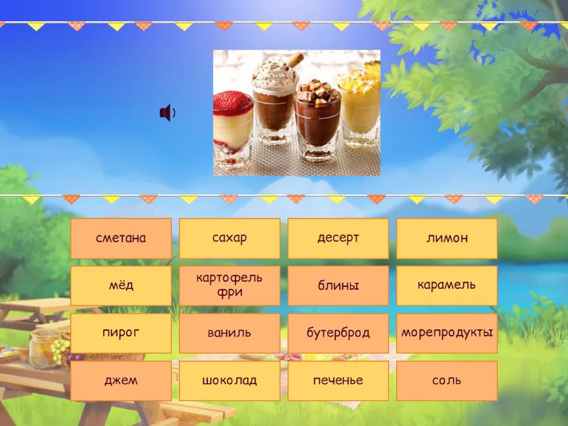 десерт, блины, пирог, бутерброд, печенье, картофель фри, карамель, ваниль, шоколад, соль, сахар, морепродукты, мёд, сметана, лимон, джем,