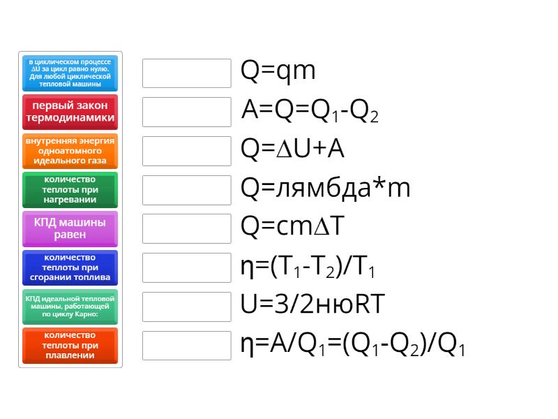 первый закон термодинамики - Q=∆U+A, количество теплоты при нагревании - Q=cm∆T, количество теплоты при плавлении - Q=лямбда*m, количество теплоты при сгорании топлива - Q=qm, внутренняя энергия одноатомного идеального газа - U=3/2нюRT, в циклическом процессе ∆U за цикл равно нулю. Для любой циклической тепловой машины - A=Q=Q1-Q2, КПД машины равен - ƞ=A/Q1=(Q1-Q2)/Q1, КПД идеальной тепловой машины, работающей по циклу Карно: - ƞ=(T1-T2)/T1,