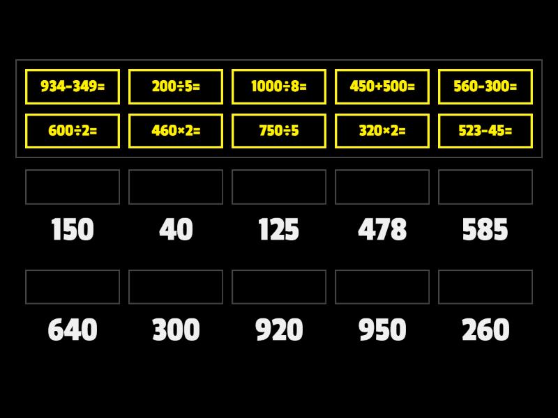 320×2= - 640, 450+500= - 950, 600÷2= - 300, 560-300= - 260, 750÷5 - 150, 523-45= - 478, 934-349= - 585, 200÷5= - 40, 460×2= - 920, 1000÷8= - 125,