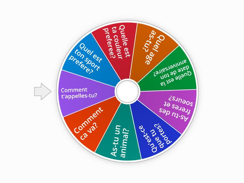 Quel est ton sport prefere?, Quelle est ta couleur preferee?, Quel age as-tu?, Quelle est la date de ton anniversaire?, As-tu des freres et soeurs?, Qu'est-ce que tu portes?, As-tu un animal?, Comment ca va?, Comment t'appelles-tu?.