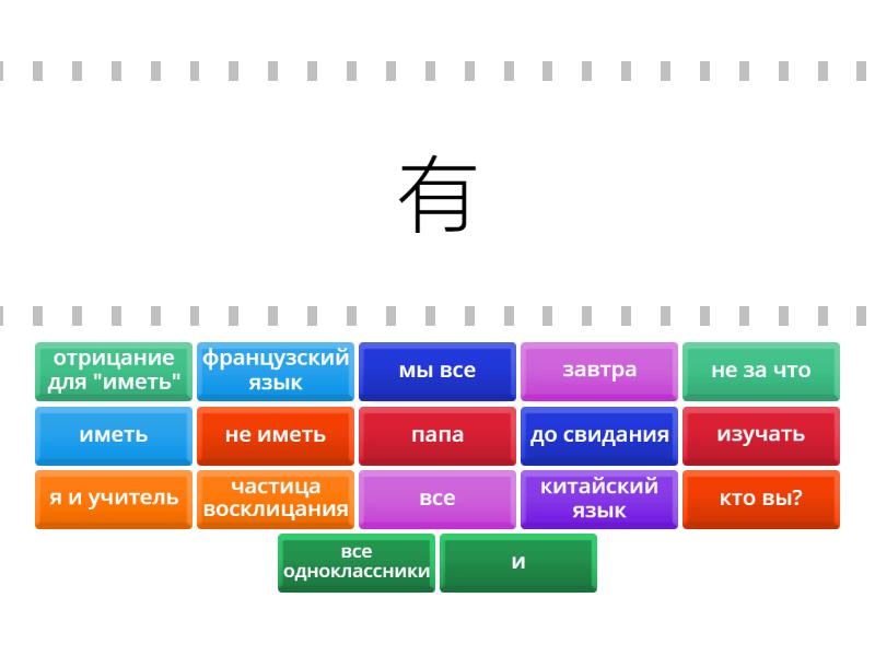 иметь - 有, папа - 爸爸, частица восклицания - 啊, и - 和, все - 都, мы все - 我们都, отрицание для "иметь" - 没, не иметь - 没有, китайский язык - 汉语, французский язык - 法语, изучать - 学, я и учитель - 我和老师, все одноклассники - 同学们都, завтра - 明天, до свидания - 再见, не за что - 不客气, кто вы? - 你是谁,