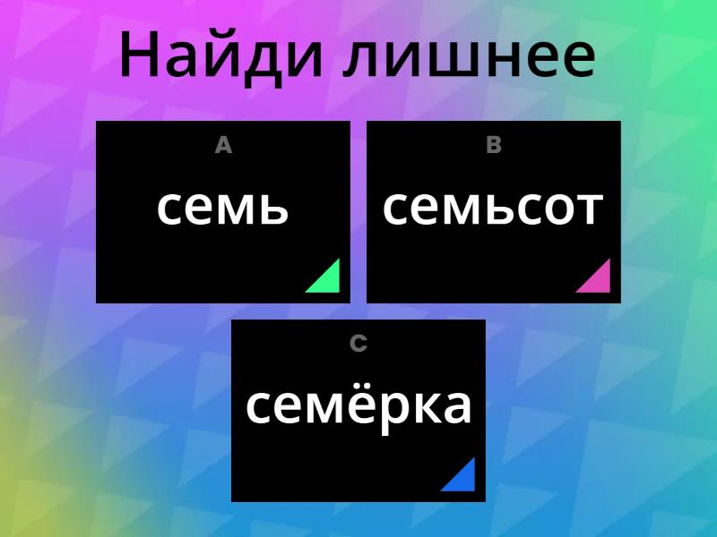 1) Найди лишнее a) семь b) семьсот c) семёрка 2) Найди лишнее a) семь b) седьмой c) семиборье 3) Найди лишнее a) семь b) седьмой c) семьсот 4) Найди лишнее a) одна седьмая b) пятьдесят c) три 5) Числительные 90, 100 в И.п. и В.п. имеют окончания a) а b) о 6) Числительные 90, 100 в Р.п. , Д.п., Тв.п. и Пр. п. имеют окончания a) а b) о 7) В каких числительных после первого корня пишется Ь? a) 15 b) 500 c) 50 d) 18 e) 80 f) 800