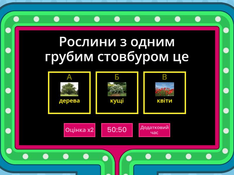 1) Рослини з одним грубим стовбуром це a) дерева b) кущі c) квіти 2) За картинкою обери квіти a) b) c) d) e) 3) Людина є представником a) рослин b) тварин c) грибів 4) Доповни речення. Рослини виробляють.... a) повітря b) воду c) ґрунт 5) До неживої природи належить... a) b) c) 6) Найвище у світі дерево - a) секвоя Гіперіон b) дуб c) каштан 7) Тривалість життя секвої і баобабу ... a) 200 років b) 100 років c) 50 років d) 5 тисяч років
