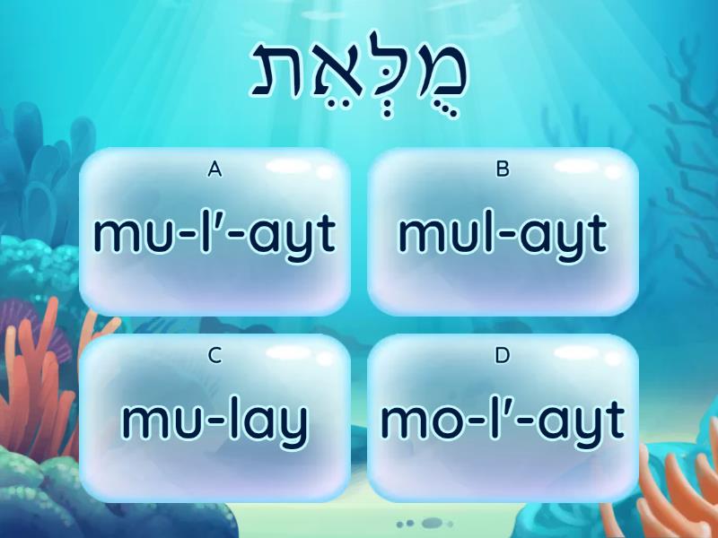 1) מֻלְּאֵת a) mu-l'-ayt b) mul-ayt c) mu-lay d) mo-l'-ayt 2) קִדְּשָׁנוּ a) kid-sha-nu b) ki-d'-sha-nu c) kod-sho d) ki-dash-nu 3) מְצַוְּךָ a) m'-tzav-cha b) m'-tza-u-cha c) m'-tza-v'-cha d) m'-a-v'-cha 4) שֶׁבְּכָל a) sheb-chol b) she-b'-chal c) sheb-kol d) she-b'-chol 5) וְשַׂמְּחֵנוּ a) v'-sa-m'-chay-nu b) v'-sa-m'-cha-nu c) v'-sam-kay-nu d) v'-sham-kay-nu 6) מְקַדְּשֵׁי a) m'-kad-shay b) m'-ka-d'-shay c) m'-cha-d'-shay d) m'-pad-shay 7) כִּכְּרוֹתַי a) kik-ro-tay b) chich-ro-tai c) ki-k'-ro-tai d) ki-k'-du-tai 8) נְקַבְּלָה a) n'-kab-la b) n'-cha-b'-la c) ni-kab-la d) n'-ka-b'-la 9) הַבְּרָכָה a) ha-b'-ra-cha b) cha-b'-ra-cha c) hab-ra-cha d) chab-ra-cha 10) הַשְּׁבִיעִי a) cha-sh'-vi-i b) ha-sh'-vi-i c) ha-s'-vi-i d) hash-vi-i