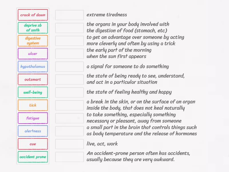 hypothalamus - a small part in the brain that controls things such as body temperature and the release of hormones, well-being - the state of feeling healthy and happy, tick - live, act, work, alertness - the state of being ready to see, understand, and act in a particular situation, deprive sb of smth - to take something, especially something necessary or pleasant, away from someone, fatigue - extreme tiredness, ulcer - a break in the skin, or on the surface of an organ inside the body, that does not heal naturally, outsmart - to get an advantage over someone by acting more cleverly and often by using a trick, cue - a signal for someone to do something, crack of dawn - the early part of the morning when the sun first appears, accident prone - An accident-prone person often has accidents, usually because they are very awkward., digestive system - the organs in your body involved with the digestion of food (stomach, etc),