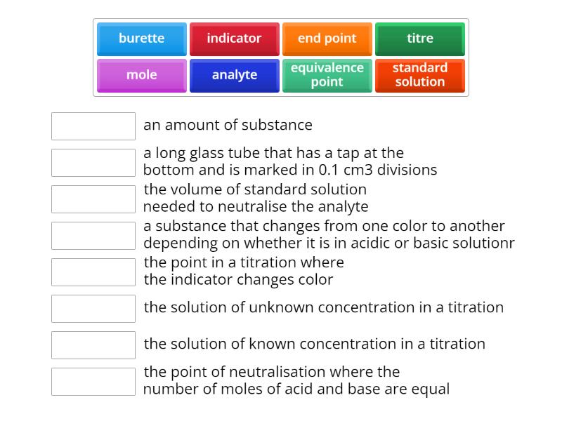 indicator - a substance that changes from one color to another depending on whether it is in acidic or basic solutionr , analyte - the solution of unknown concentration in a titration, standard solution - the solution of known concentration in a titration, end point - the point in a titration where the indicator changes color, titre - the volume of standard solution needed to neutralise the analyte, equivalence point - the point of neutralisation where the number of moles of acid and base are equal, burette - a long glass tube that has a tap at the bottom and is marked in 0.1 cm3 divisions, mole - an amount of substance,