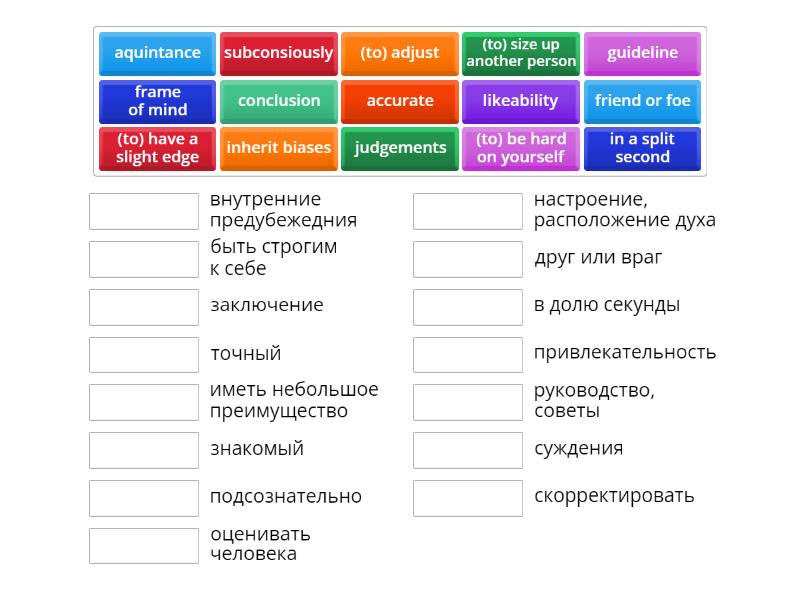 subconsiously - подсознательно , judgements - суждения , accurate - точный , (to) be hard on yourself - быть строгим к себе, (to) size up another person - оценивать человека , conclusion - заключение , likeability - привлекательность , in a split second - в долю секунды , friend or foe - друг или враг, inherit biases - внутренние предубежедния, aquintance - знакомый, (to) adjust - скорректировать, (to) have a slight edge - иметь небольшое преимущество , guideline - руководство, советы , frame of mind - настроение, расположение духа ,