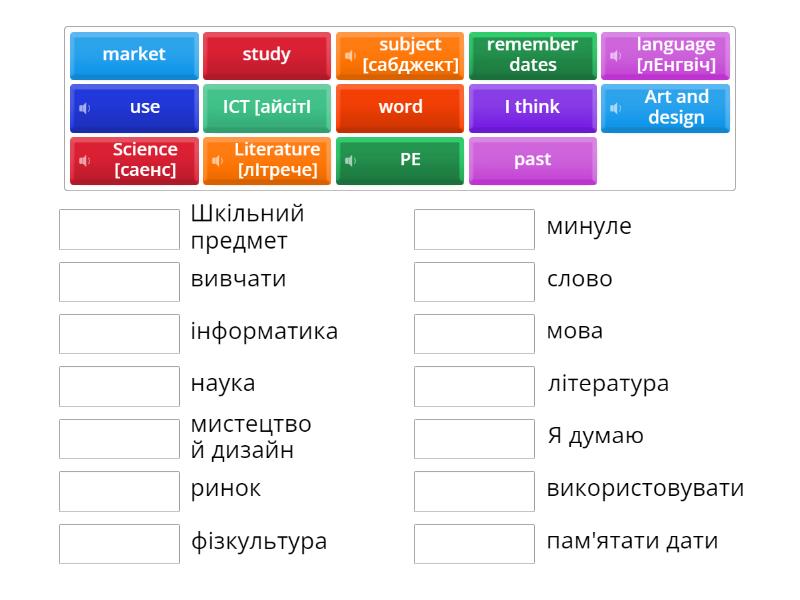 language [лЕнгвіч] - мова, Literature [лІтрече] - література, remember dates - пам'ятати дати , study - вивчати, I think - Я думаю , Art and design - мистецтво й дизайн, Science [саенс] - наука, use - використовувати , past - минуле, ICT [айсітІ - інформатика, PE - фізкультура, market - ринок, subject [сабджект] - Шкільний предмет, word - слово ,