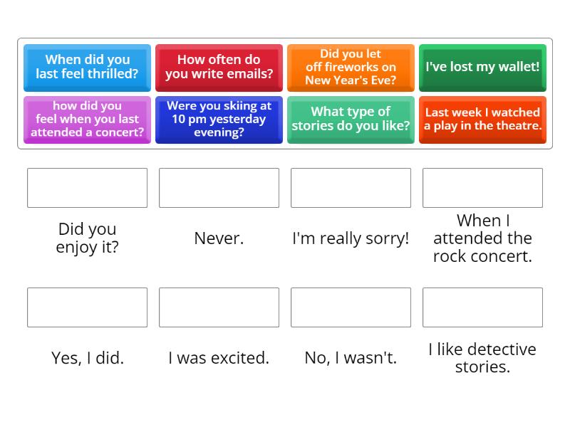 how did you feel when you last attended a concert? - I was excited., Did you let off fireworks on New Year's Eve? - Yes, I did., What type of stories do you like? - I like detective stories., Were you skiing at 10 pm yesterday evening? - No, I wasn't., I've lost my wallet! - I'm really sorry!, How often do you write emails? - Never., Last week I watched a play in the theatre. - Did you enjoy it?, When did you last feel thrilled? - When I attended the rock concert.,