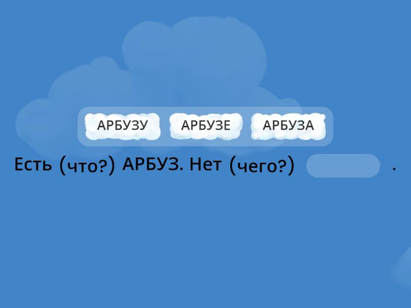Есть (что?) АРБУЗ. Нет (чего?) ____ . Есть (что?) МАШИНА. Нет (чего?) ____ . Есть (что?) ОКНО. Нет (чего?) ____ . Есть (кто?) ДЕВОЧКА. Нет (кого?) ____ . Есть (кто?) СЛОН. Нет (кого?) ____ . Есть (что?) ЁЛКА. Нет (чего?) ____ . Девочка стоит около (чего?) ____ . Птица летает у (чего?) ____ . Папа моет окно у (чего?) ____ . Мама варит суп из ____ .