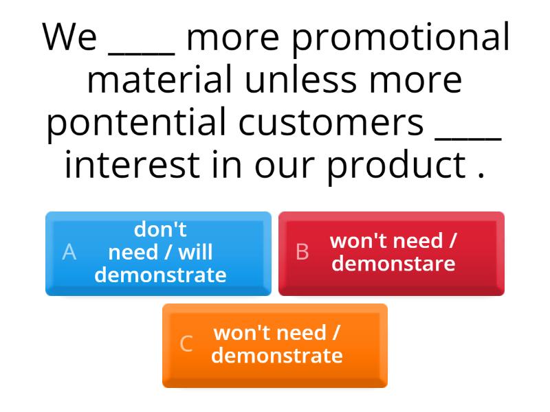 1) If you press this button, the conference call ___ recording. a) starts b) start c) will start 2) I'll start making the report ___ come back from the negotiations. a) when you b) when you will c) when will you 3) Susan will check her emails if she ___ time a) will have b) has c) have 4) When people ___ too much, they often ruin their work-life balance. a) work b) will work c) are working 5) Unless it is sunny tomorrow, ____ be able to show our counterparts the production site. a) we don't b) we won't c) we will 6) If this project ____, I might get a promotion or a pay rise. a) go well b) will go well c) goes well 7) You ____ difficulty drafting this contract if you ____ the new amendments to the law. a) may have / will ingnore b) have / will ignore c) will have / ignore 8) Rumours spread easily ____ all the parties sign an NDA. a) if b) unless c) if not 9) What _____ if you ___ to convince the boss? a) you will do / manage b) will you do / will manage c) will you do / manage 10) We ____ more promotional material unless more pontential customers ____ interest in our product . a) don't need / will demonstrate b) won't need / demonstare c) won't need / demonstrate