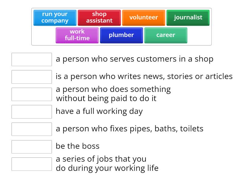 journalist - is a person who writes news, stories or articles, work full-time - have a full working day, plumber - a person who fixes pipes, baths, toilets, career - a series of jobs that you do during your working life, volunteer - a person who does something without being paid to do it, shop assistant - a person who serves customers in a shop, run your company - be the boss,