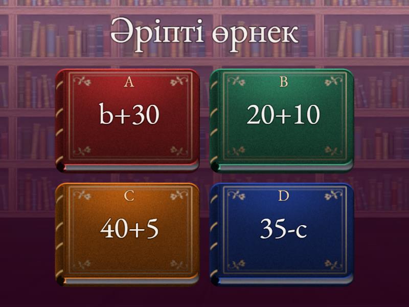 1) Әріпті өрнек a) b+30 b) 20+10 c) 40+5 d) 35-c 2) Санды өрнек a) f-40 b) 20+30 c) k-60 d) 50-30 3) Әріпті өрнекті a) 30+50 b) 70-a c) 55+x d) 10-5 4) Санды өрнек a) 40+10 b) k-30 c) c+20 d) 10-2