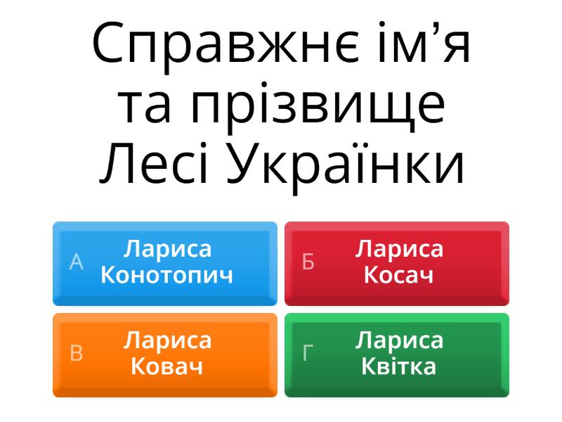 1) Справжнє імʼя та прізвище Лесі Українки a) Лариса Конотопич b) Лариса Косач c) Лариса Ковач d) Лариса Квітка