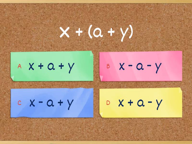 1) х + (a + y) a) x + a + y b) x - a - y c) x - a + y d) x + a - y 2) p - (m + n) a) p - m + n b) p - m - n c) p + m - n d) p + m + n 3) a - (-b + c) a) a + b + c b) a - b + c c) a + b - c d) a - b - c 4) - (a + b) + c a) a + b + c b) a - b + c c) -a - b - c d) -a - b + c 5) a + (-m - n) a) a + m + n b) a - m - n c) a + m - n d) a - m + n 6) a - (t + p) a) a - t + p b) a + t - p c) -a - t - p d) a - t - p 7) (a + b + c) a) a + b + c b) -a + b - c c) a - b - c d) a - b+ c 8) - (d + b - t) a) -d + b+ t b) -d - b - t c) -d - b + t d) d - b + t 9) -(a + b) + (c - d) a) -a + b - c + d b) -a - b + c - d c) a + b + c - d d) a - b - c - d 10) (m+3)-(k-5) a) m+3-k-5 b) -m-3+k+5 c) m+3 - k+5 d) m-3 - k + 5