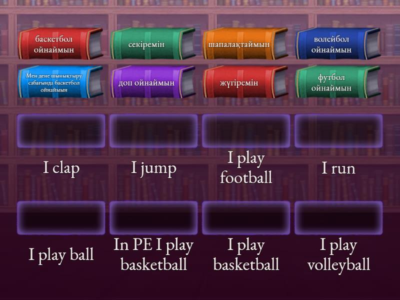 доп ойнаймын - I play ball, жүгіремін - I run , секіремін - I jump , баскетбол ойнаймын - I play basketball , футбол ойнаймын - I play football , волейбол ойнаймын - I play volleyball , шапалақтаймын - I clap , Мен дене шынықтыру сабағында баскетбол ойнаймын - In PE I play basketball ,