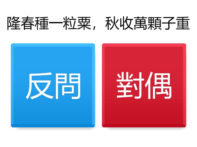 1) 隆春種一粒粟,秋收萬顆子重 a) 反問 b) 對偶 2) 他跑得比風還快! a) 誇張 b) 對比 c) 排比 d) 擬人 3) 這麼簡單的題目,你怎麼會不懂呢? a) 反問 b) 誇張 c) 設問 4) 誰是最勤勞的人?當然是我們的清潔工人。 a) 設問 b) 對偶 c) 對比 d) 誇張 5) 有人喜歡熱鬧的都市,有人喜歡寧靜的鄉村。 a) 設問 b) 對比 c) 擬人 d) 比喻 6) 我們要認真聽課,認真寫作業,認真複習。 a) 對比 b) 設問 c) 排比 d) 誇張 7) 小樹苗在風中快樂地跳舞。 a) 擬人 b) 誇張 8) 她的眼睛像星星一樣閃亮。 a) 排比 b) 設問 c) 比喻 d) 反問 9) 難道你不覺得這樣的行為很自私嗎? a) 反問 b) 設問 10) 夜晚的星星在天空中悄悄地眨着眼睛。 a) 比喻 b) 擬人 11) 少壯不努力,老大徒傷悲。 a) 對比 b) 對偶 c) 誇張 d) 反問 12) 有人喜歡熱鬧的市區,有人喜歡安靜的郊外。 a) 對偶 b) 對比 13) 誰是我們的好朋友?當然是書本啦! a) 反問 b) 設問 14) 她的笑容像陽光一樣溫暖。 a) 明喻 b) 擬人 15) 難道你不覺得保護環境是每個人的責任嗎? a) 設問 b) 反問 16) 誰是我們學習的好幫手?當然是字典啦! a) 設問 b) 反問 17) 忍一時,風平浪靜,退一步,海闊天空 a) 對偶 b) 對比