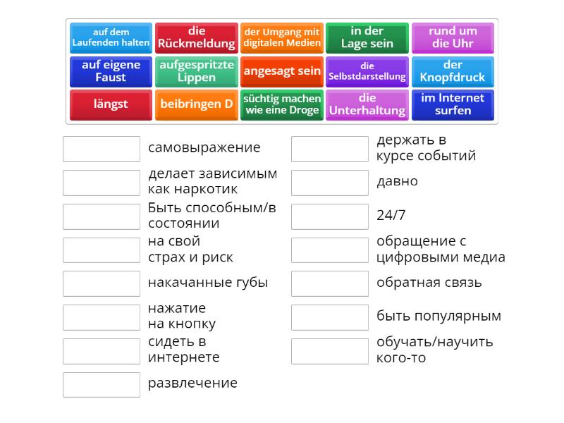 längst - давно, rund um die Uhr - 24/7, auf dem Laufenden halten - держать в курсе событий , die Unterhaltung - развлечение , auf eigene Faust - на свой страх и риск, im Internet surfen - сидеть в интернете , angesagt sein - быть популярным, die Selbstdarstellung - самовыражение , aufgespritzte Lippen - накачанные губы, der Umgang mit digitalen Medien - обращение с цифровыми медиа , der Knopfdruck - нажатие на кнопку, die Rückmeldung - обратная связь , beibringen D - обучать/научить кого-то, in der Lage sein - Быть способным/в состоянии, süchtig machen wie eine Droge - делает зависимым как наркотик ,