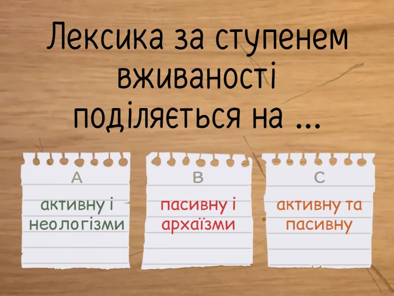1) Лексика за ступенем вживаності поділяється на ... a) активну і неологізми b) пасивну і архаїзми c) активну та пасивну 2) До активної лексики належать ... a) слова, які часто вживають усі мовці або частина мовці у тій чи тій сфері суспільного життя b) застарілі слова й неологізми 3) До пасивної лексики належать ... a) слова, які часто вживають усі мовці або частина мовці у тій чи тій сфері суспільного життя b) застарілі слова й неологізми 4) Застарілими називають слова, ... a) які вийшли з активного вжитку b) якими користуються всі носії мови незалежно від професії, виду діяльності, місця проживання c) які з'явилися нещодавно 5) Архаїзми – це слова, ... a) які вийшли з активного вжитку, бо були замінені іншими словами b) які вийшли з активного вжитку, тому що зникли названі ними реалії, явища c) які з'явилися нещодавно 6) Історизми – це слова, ... a) які вийшли з активного вжитку, бо були замінені іншими словами b) які вийшли з активного вжитку, тому що зникли названі ними реалії, явища c) які з'явилися нещодавно 7) Неологізми – це слова, ... a) які вийшли з активного вжитку, бо були замінені іншими словами b) які вийшли з активного вжитку, тому що зникли названі ними реалії, явища c) які з'явилися нещодавно 8) дзиґар – це... a) історизми b) архаїзми c) неологізми 9) кріпак– це... a) історизми b) архаїзми c) неологізми 10) кольчуга – це... a) історизми b) архаїзми c) неологізми 11) бот – це... a) історизми b) архаїзми c) неологізми 12) перст – це... a) історизми b) архаїзми c) неологізми
