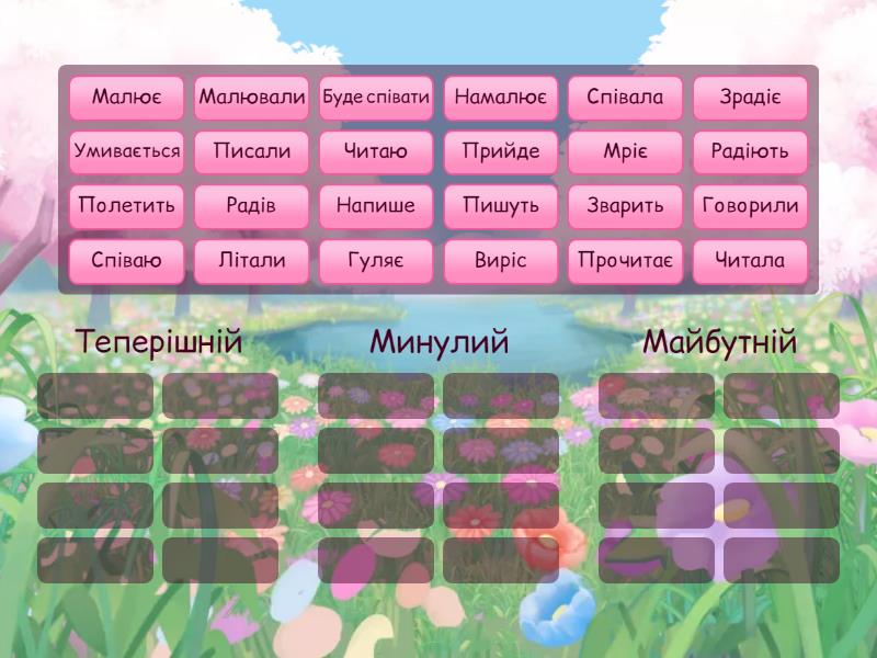 Теперішній: Читаю, Гуляє, Пишуть, Співаю, Умивається, Радіють, Малює, Мріє, Минулий: Співала, Читала, Малювали, Говорили, Радів , Писали, Літали, Виріс, Майбутній : Прийде, Зварить, Зрадіє, Напише, Намалює, Прочитає, Буде співати, Полетить,