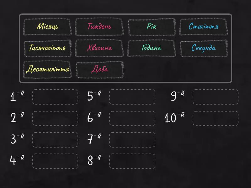 Секунда, Хвилина, Година, Доба, Тиждень, Місяць, Рік, Десятиліття, Століття, Тисячоліття.