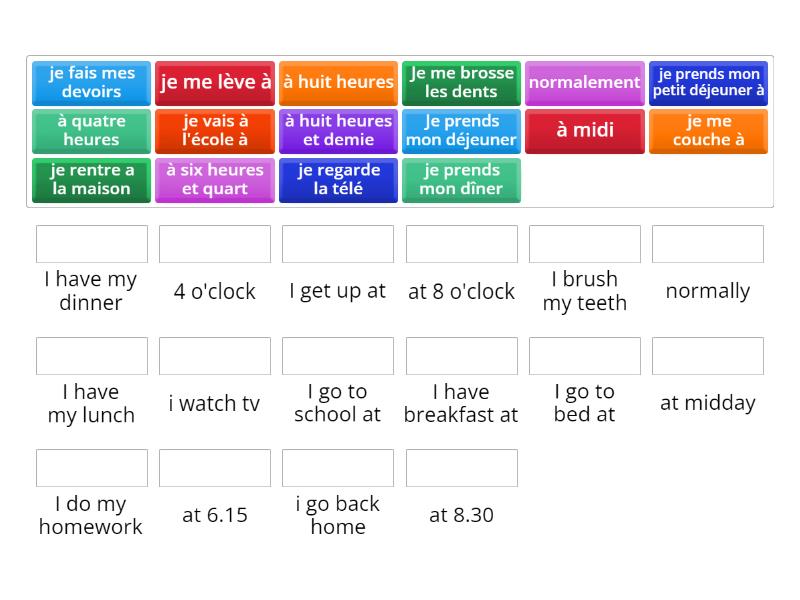je me lève à - I get up at, je prends mon petit déjeuner à - I have breakfast at, je vais à l'école à - I go to school at, je fais mes devoirs - I do my homework, je regarde la télé - i watch tv, je rentre a la maison - i go back home, je me couche à - I go to bed at, normalement - normally, à huit heures - at 8 o'clock, à midi - at midday, à quatre heures - 4 o'clock, à huit heures et demie - at 8.30, à six heures et quart - at 6.15, Je prends mon déjeuner - I have my lunch, je prends mon dîner - I have my dinner, Je me brosse les dents - I brush my teeth,
