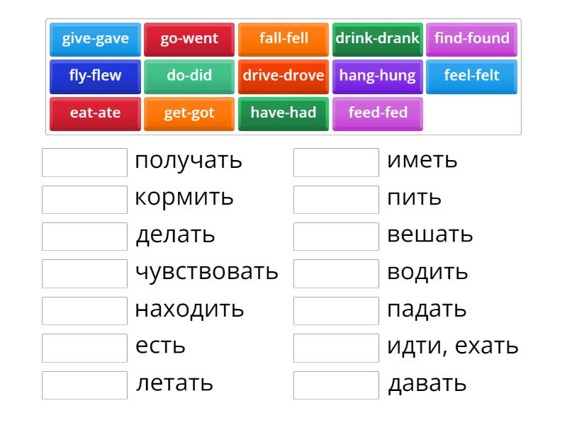 do-did - делать, drink-drank - пить, drive-drove - водить, eat-ate - есть, fall-fell - падать, feed-fed - кормить, feel-felt - чувствовать, find-found - находить, fly-flew - летать, get-got - получать, give-gave - давать, go-went - идти, ехать, hang-hung - вешать, have-had - иметь,