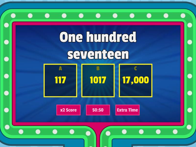 1) One hundred seventeen a) 117 b) 1017 c) 17,000 2) 675 a) sixteen hundred b) seventy five c) six hundred seventy-five d) six thousand seventy-five 3) 2,000 a) two thousand b) two hundred c) twenty 4) 13, 000 a) thirteen b) thirteen thousand c) thirty hundred 5) 14,300 a) Fourteen thousand three b) fourteen thousand thirteen c) fourteen thousand three hundred 6) 19,224 a) Nine hundred twenty-four b) nineteen thousand two hundred twenty-four c) nineteen hundred