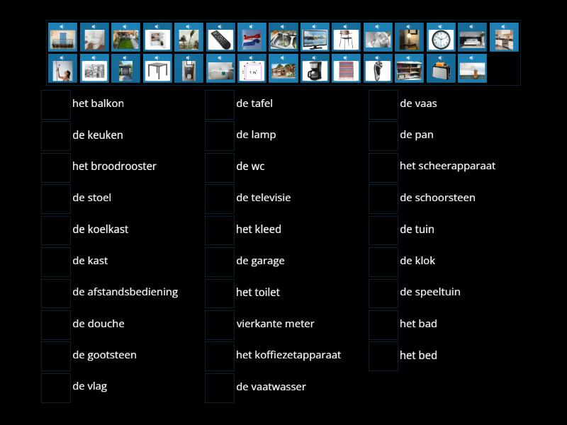 de speeltuin, de garage, het balkon, de schoorsteen, de wc, het toilet, de keuken, de stoel, vierkante meter, de tuin, de televisie, de tafel, de kast, het kleed, de vaas, de lamp, het koffiezetapparaat, de afstandsbediening, het scheerapparaat, de koelkast, de gootsteen, de klok, de douche, het bed, de vaatwasser, de pan, het bad, de vlag, het broodrooster,