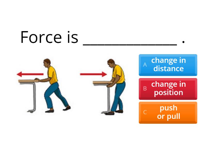1) Force is _____________ . a) change in distance b) change in position c) push or pull 2) Which is a pulling force ? a) Kicking a soccer ball b) Using a wagon c) Pedaling a bike 3) Which is a pushing force ? a) Closing a door b) Using a wagon c) Helping a friend up 4) Which ramp would move the car fastest and farthest? a) 1 b) 2 c) 3 d) 4 5) Which is a balanced force ? a) b) 6) Who has more speed ? a) Rabbit b) Tortoise 7) Which type of motion is this ? a) Back and forth b) Straight-line c) Round and round 8) Which type of motion is this ? a) Zig zag b) Straight-line c) Up and down 9) What is shown here ? a) Speed b) Distance c) Direction 10) A force can change the direction of motion of an object. a) True b) False