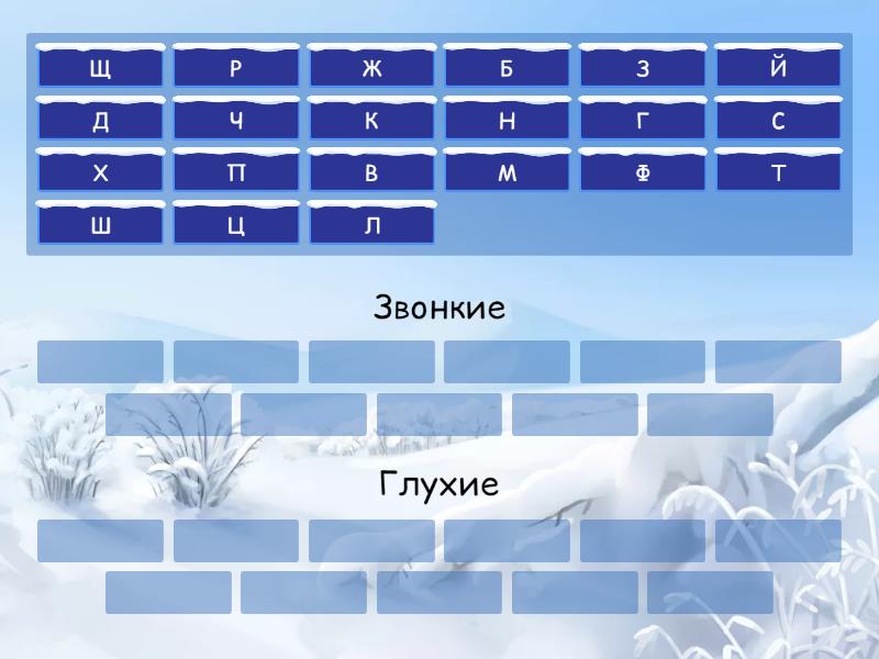 Звонкие: Б, В, Г, Д, Ж, З, Л, М, Н, Р, Й, Глухие: П, Ф, К, Т, Ш, С, Х, Ц, Ч, Щ,