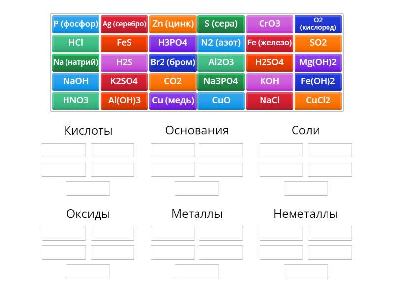 Кислоты: HCl, H2SO4, H2S, HNO3, H3PO4, Основания: NaOH, KOH, Mg(OH)2, Fe(OH)2, Al(OH)3, Соли: NaCl, K2SO4, CuCl2, Na3PO4, FeS, Оксиды: SO2, CO2, Al2O3, CuO, CrO3, Металлы: Ag (серебро), Cu (медь), Fe (железо), Zn (цинк), Na (натрий), Неметаллы: P (фосфор), S (сера), O2 (кислород), N2 (азот), Br2 (бром),