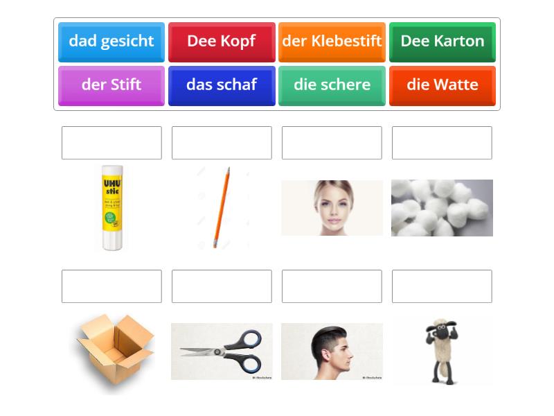 die Watte, Dee Karton, die schere, der Stift, der Klebestift, Dee Kopf, das schaf, dad gesicht,