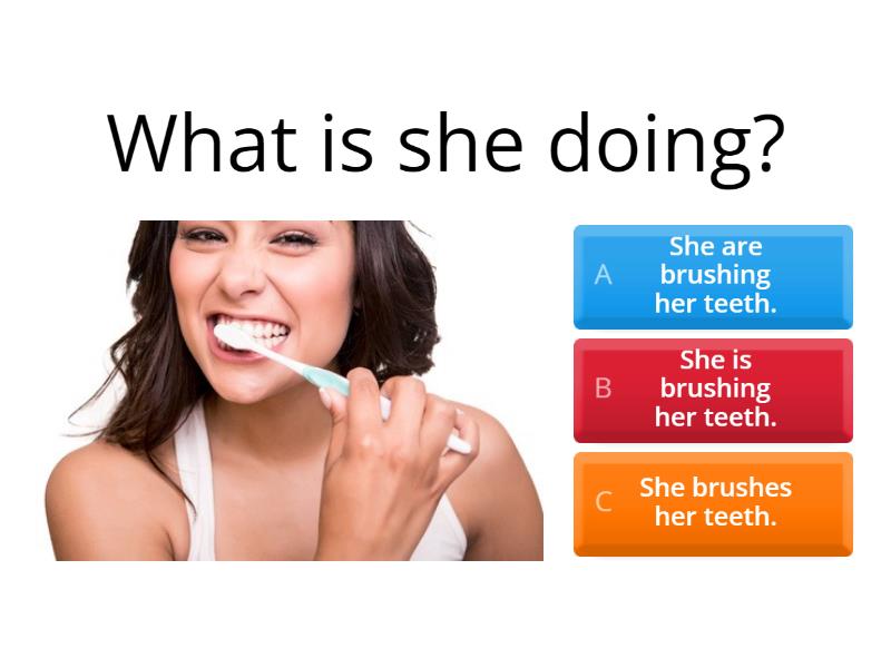 1) What is she doing? a) She are brushing her teeth. b) She is brushing her teeth. c) She brushes her teeth. 2) What are they doing? a) They are swimming. b) They is swimming. c) They swim. 3) What is she doing? a) She am reading. b) She reads. c) She is reading. 4) What is she doing? a) She is washing dishes. b) She are washing dishes. c) She am washing dishes. 5) What is he doing? a) He are surfing. b) He is surfing. c) He am surfing. 6) What are they doing? a) They are cooking. b) They cook. c) They are cook. 7) What is she doing? a) He is sleep. b) they are sleep. c) She is sleeping. 8) What are they doing? a) They walk. b) They are walking. c) They are walk. 9) What are they doing? a) They eat dinner. b) We are eating dinner. c) They are eating dinner.