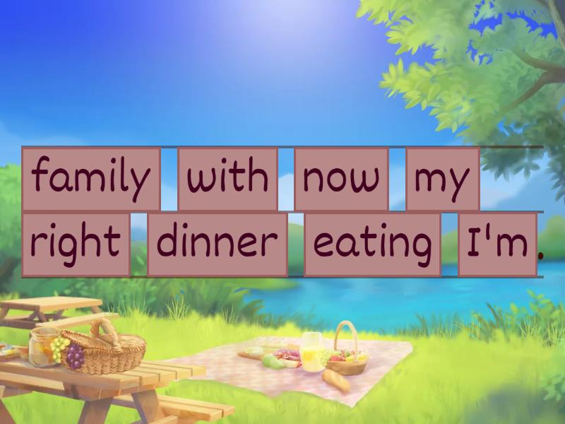 I'm eating dinner with my family right now. , Tim is talking to his Grandma at the moment., Do you always have breakfast at home? , I don't usually eat lunch at school. , My parents often make pizza on Sunday. , Jenny rarely goes to the cinema., We never go to school on Saturdays. , I play tennis twice a week - on Monday and Thursday. , Are you eating my snack? , Listen! Carol is playing the violin! , Look! Cindy is wearing a new dress. ,