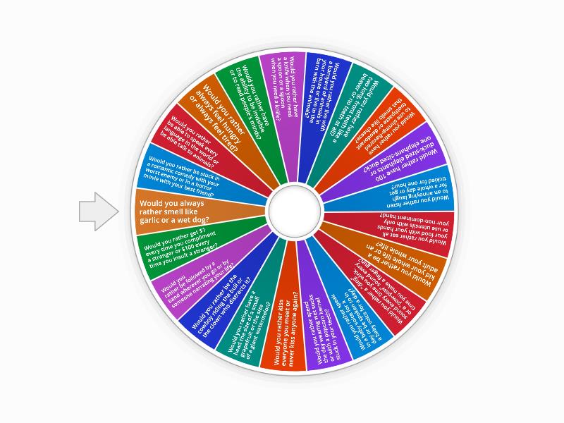 Would you rather be stuck in a romantic comedy with your worst enemy or in a horror movie with your best friend?, Would you rather be able to speak every language in the world or be able talk to animals?, Would you rather always feel hungry or always feel tired?, Would you rather have the ability to be invisible or to read people’s minds?, Would you rather have a knife when you need a spoon or a spoon when you need a knife?, Would you rather live with a barnyard of animals in your house or live in the barn with the animals?, Would you rather have two long, front teeth like a beaver or no teeth at all?, Would you rather have to use shrimp-flavored toothpaste or deodorant that smells like cheese?, Would rather have 100 duck-sized elephants or one elephant-sized duck?, Would you rather listen to an annoying laugh for a whole day or get tickled for one hour?, Would you rather eat all your food with your hands or use utensils with only your non-dominant hand?, Would you rather be a kid your whole life or an adult your whole life?, Would you rather a "ding" sound every time you wink, or a "pow-pow" sound every time you make a finger gun?, Would you rather speak in a baby voice for a day or be spoken to in a baby voice for a day?, Would you rather spend the day wearing wet socks or with a popcorn kernel stuck in your teeth?, Would you rather kiss everyone you meet or never kiss anyone again?, Would you rather have a head the size of a small grapefruit or the size of a giant watermelon?, Would you rather be the cowboy riding the bull or the clown who distracts it?, Would you rather be followed by a band wherever you go or by someone narrating your life?, Would you rather get $1 every time you compliment a stranger or $100 every time you insult a stranger?, Would you always rather smell like garlic or a wet dog?.